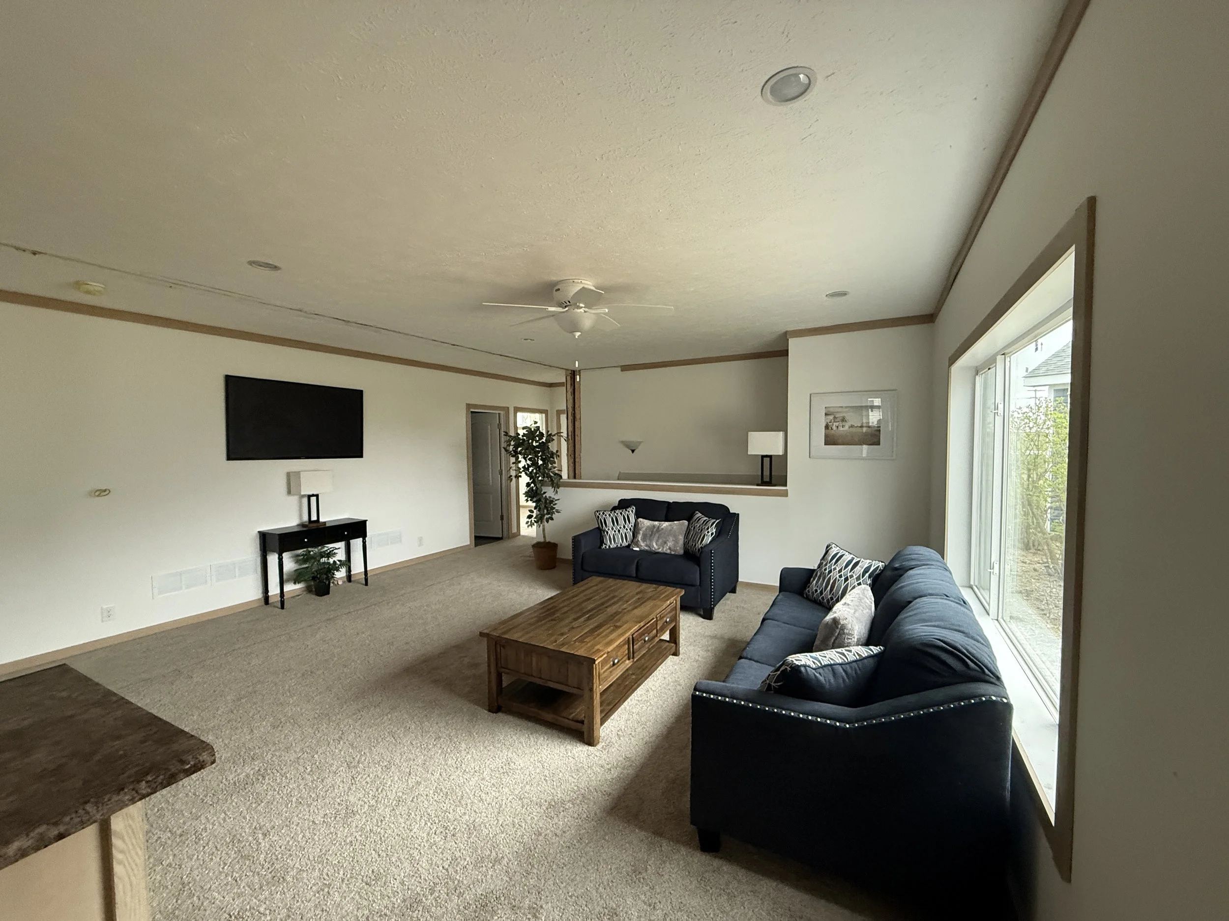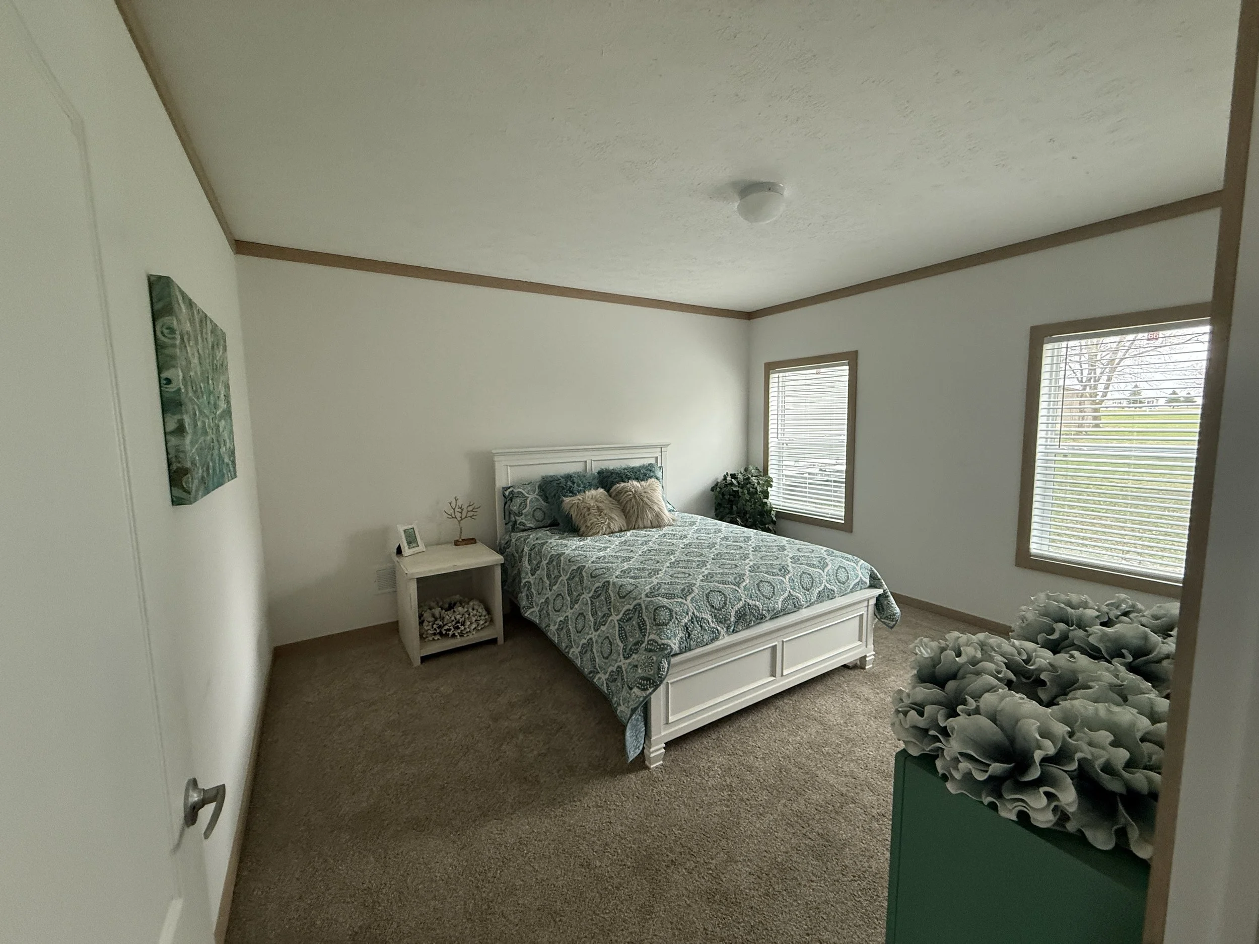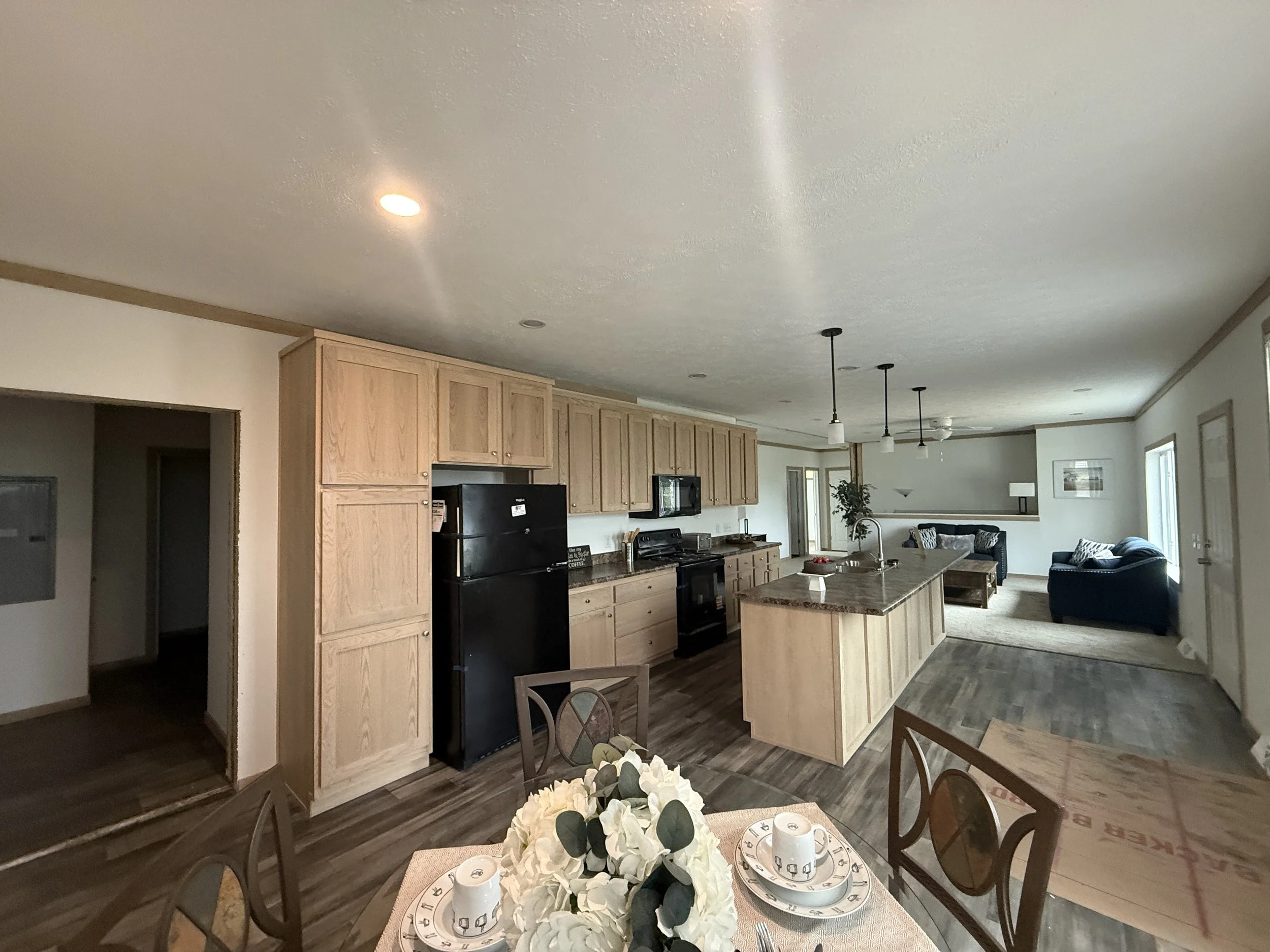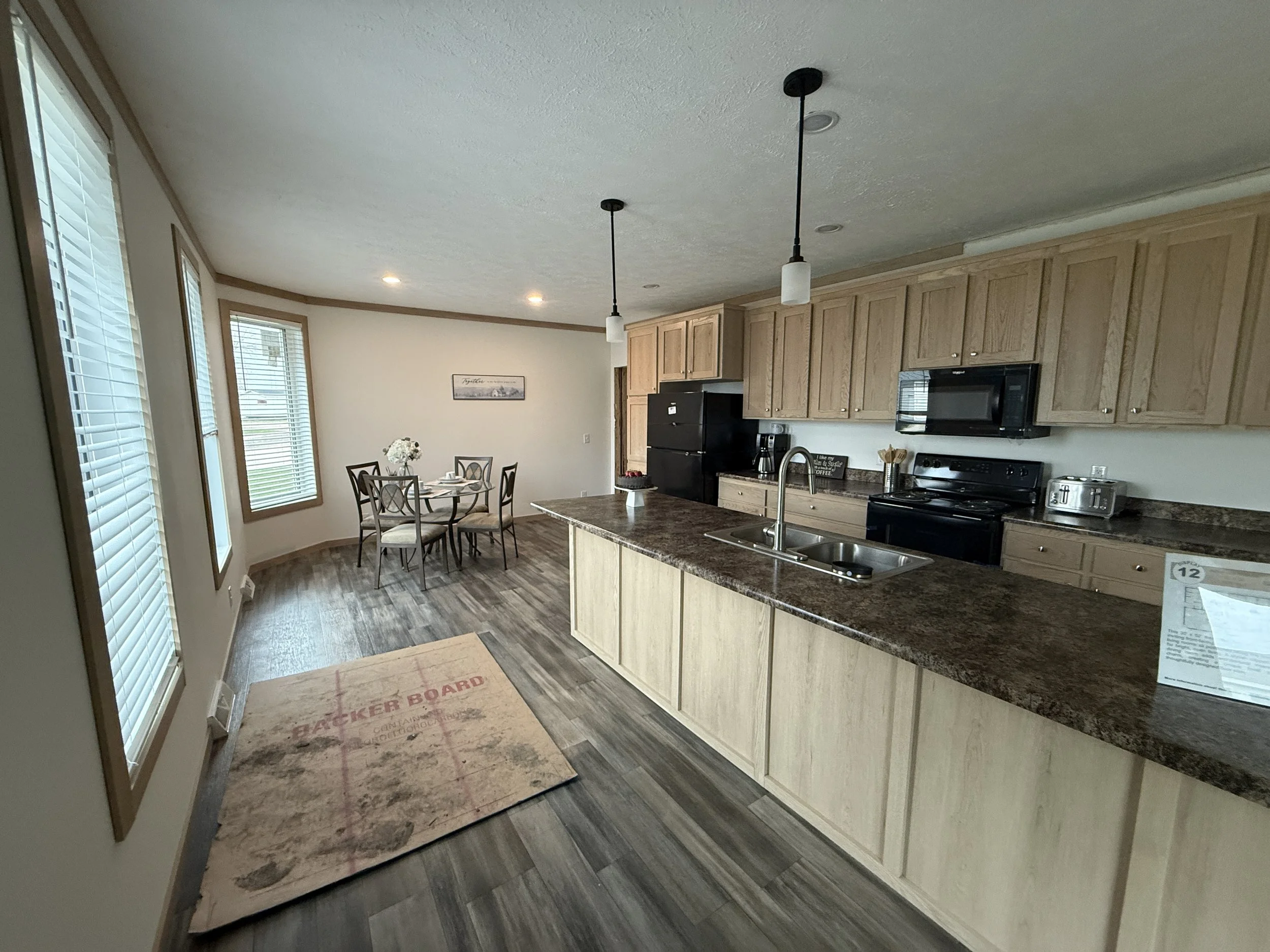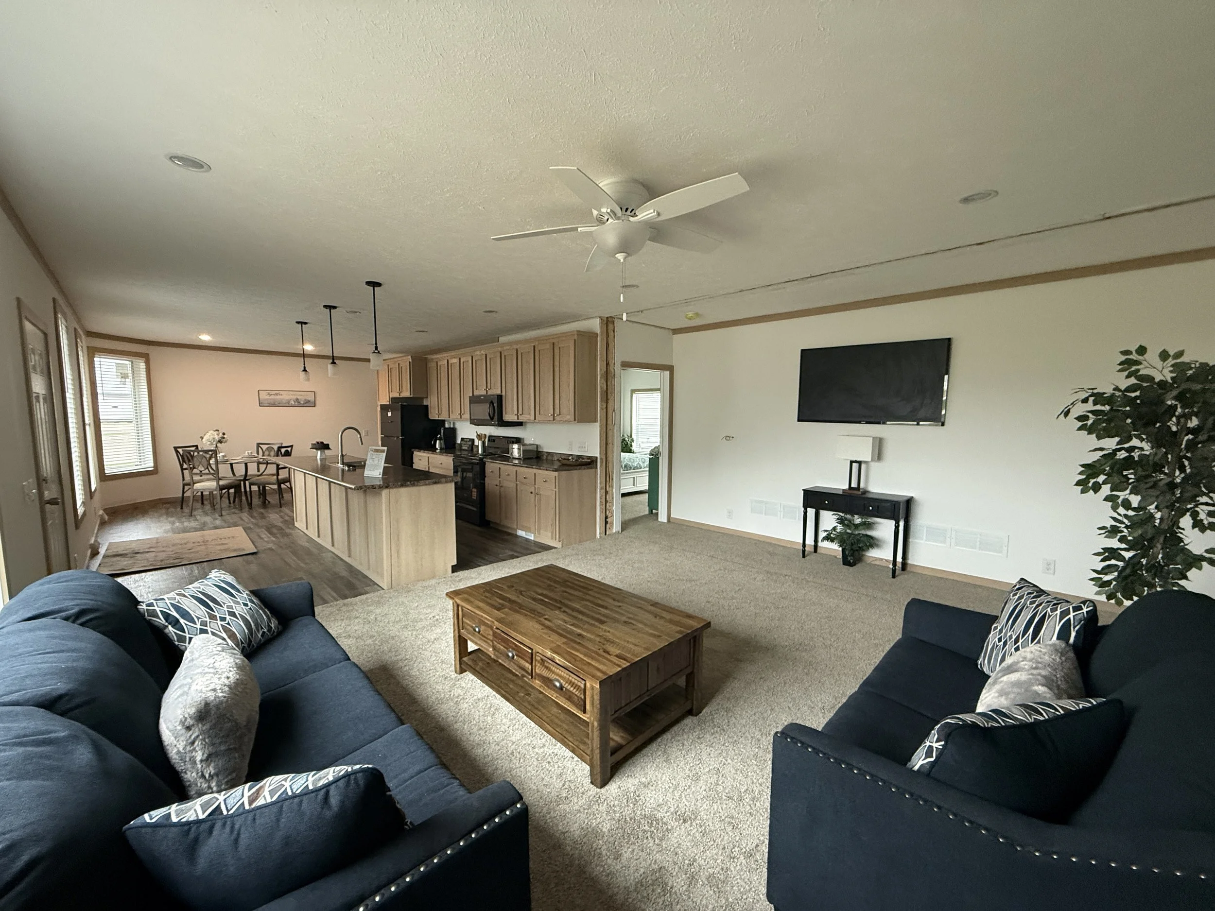 This 30' x 52' three-bed, two-bath home features an inviting front-facing layout with the kitchen, dining, and living rooms all positioned along the front of the home for bright, open living. A stylish clipped corner in the dining room adds architectural interest and extra charm, creating a unique focal point in this thoughtfully designed floor plan.