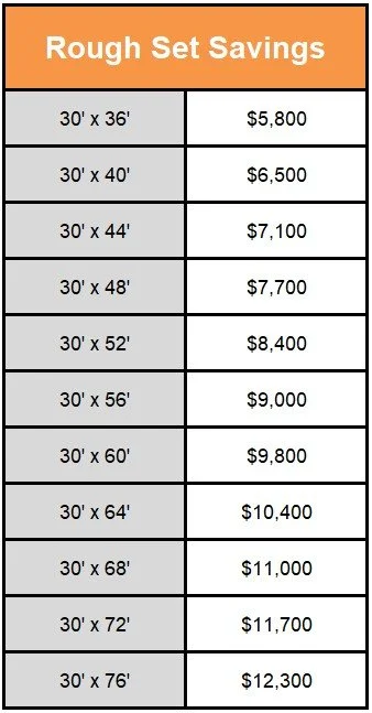 Now that you have seen our base prices, you should also know about our rough set option. It originated from our genuine interest in saving people money. One way we accomplished this is by giving you the option to do on-site finish work yourself. After receiving positive feedback with many prospective customers on this concept, we are now offering this option to everyone. Check out the table to see your projected savings according to home size. Also, below you can find a detailed list of finish work you would have to do.